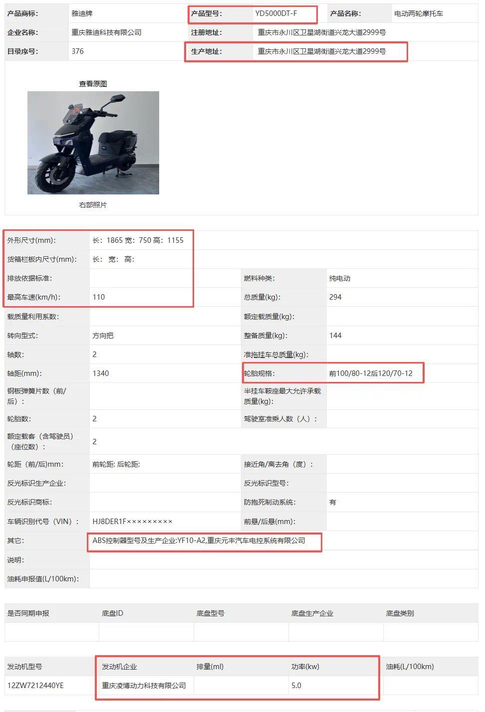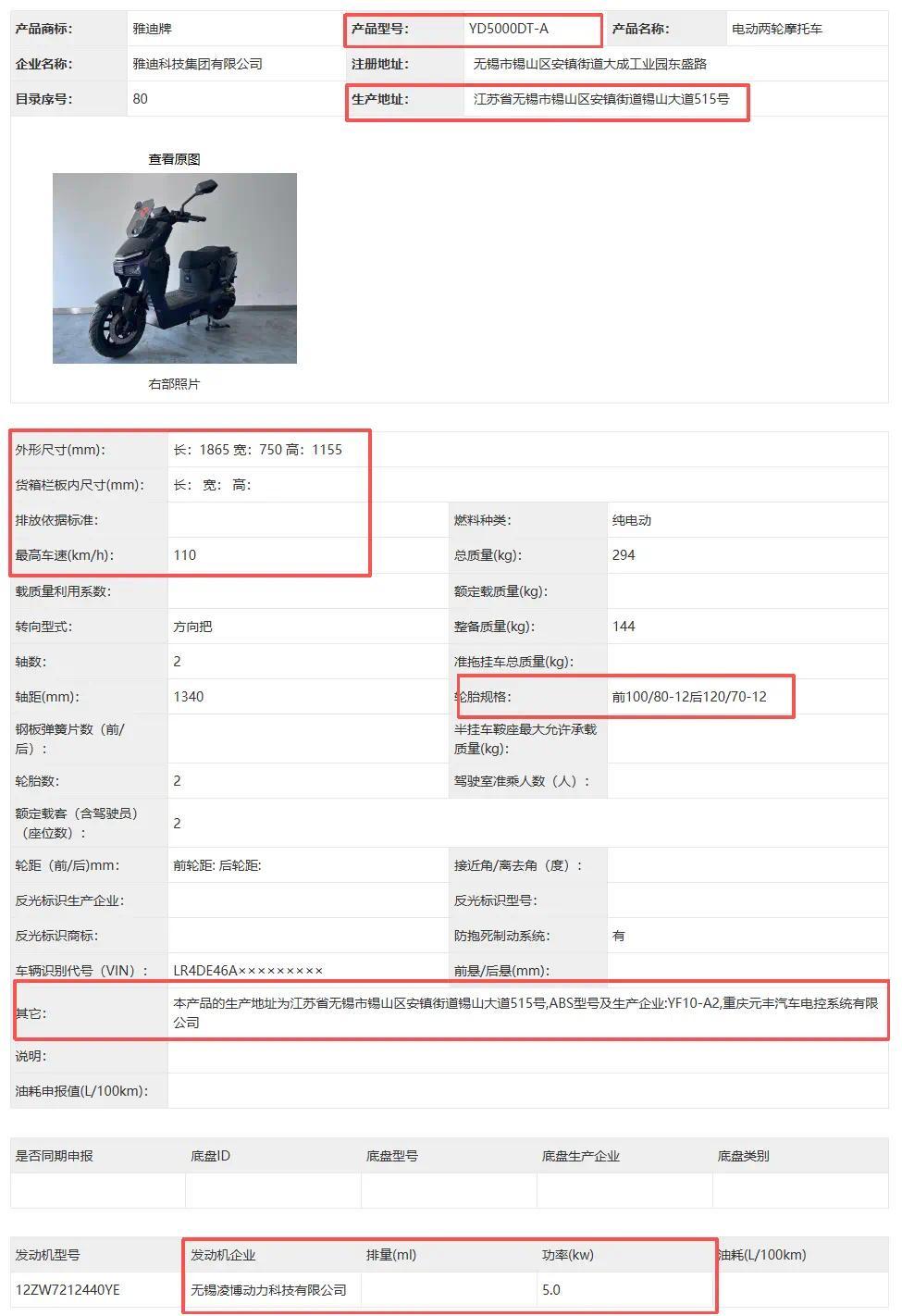 两个型号车型的主要区别在于生产基地与核心供应链配套差异。其中YD5000DT-A型号由雅迪无锡总部基地生产,配套的ABS系统、驱动电机均来自无锡本地核心供应链厂商;YD5000DT-F型号则由雅迪重庆生产基地制造,对应的ABS和电机部件适配重庆本地配套体系。